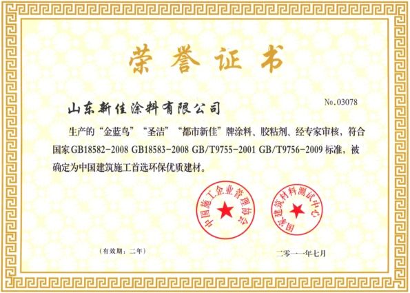 新佳涂料榮獲中國建筑施工首選優(yōu)質(zhì)建材稱號(hào)