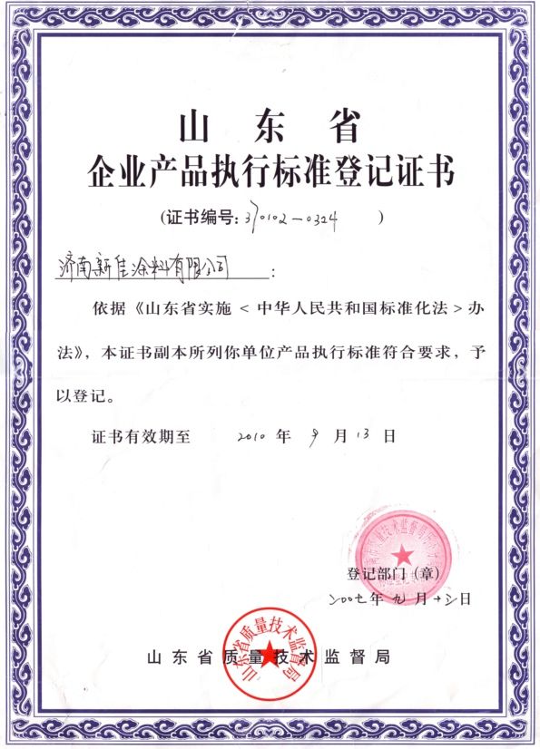 企業產品執行標準登記證書