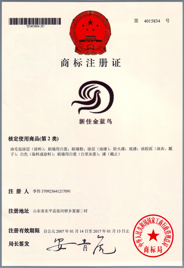 新佳涂料金藍鳥注冊證